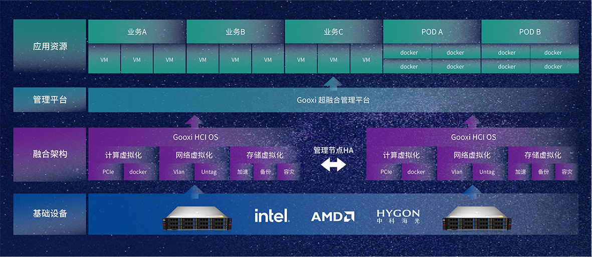 Gooxi HCI整体解决方案基于dcbox小金库自研服务器底座,适配自研超融合软件平台,采用最新的云计算技术,实现IT资源敏捷弹性调度的同时保证业务、数据落在本地,既提高数据安全性、符合监管合规需求,也提高业务高可用、资源充分利用率,为企业在数字化转型阶段给予助力。